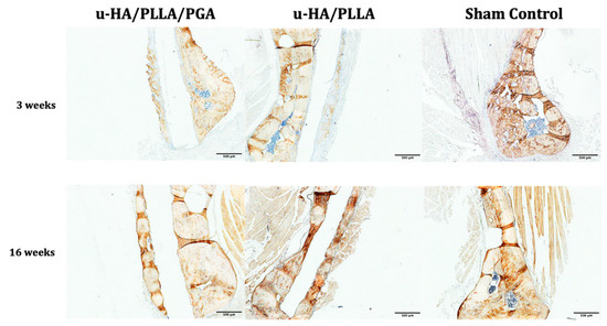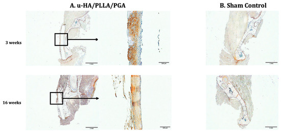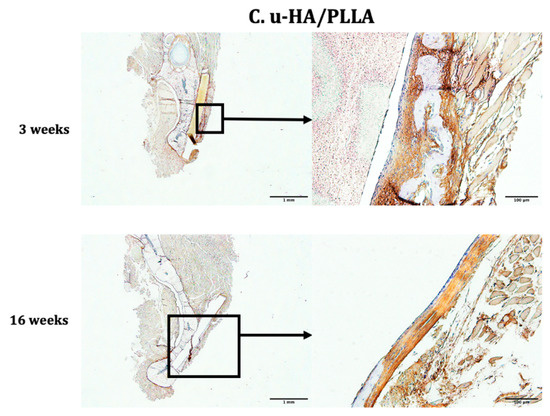 The Runx2 expression patterns of the u-HA/PLLA and u-HA/PLLA/PGA subgroups were similar (Figure 8). At Week 3, Runx2-positive cells were clearly observed in the area in which newly formed bone was identified, close to the material sheets. In contrast, at Week 16, Runx2 expression was not readily observed in either material group (Figure 8).