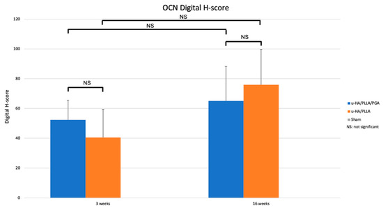 Digital H-scores based on IHC staining using an anti-OCN antibody in the u-HA/PLLA/PGA and u-HA/PLLA subgroups.