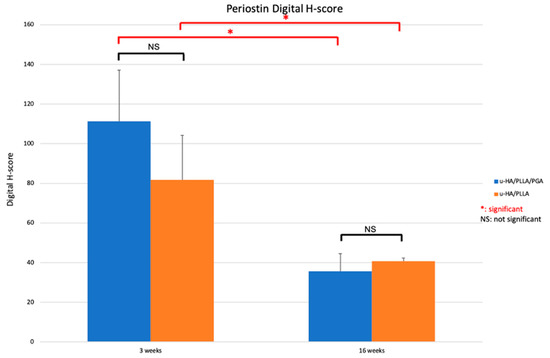 Digital H-scores based on IHC staining using an anti-periostin antibody in the u-HA/PLLA/PGA and u-HA/PLLA subgroups. * p < 0.05.