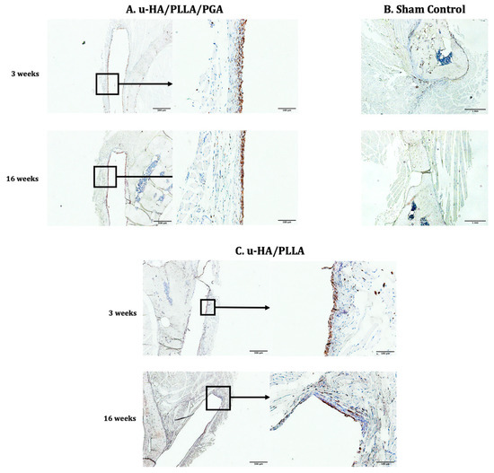 Cells positive for CD68 were concentrated as a layer covering the material sheets. When magnified, these layers seemed to be thinner during the later stage compared with the early stage in both subgroups. Furthermore, the layers of CD68-positive cells were positioned in the same area as the fibrous tissue identified in the histological assessment (Figure 14).