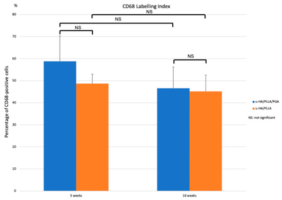 Labeling index based on IHC staining using an anti-CD68 antibody in the u-HA/PLLA/PGA and u-HA/PLLA subgroups.