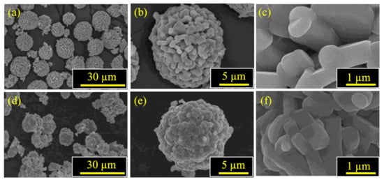SEM images of the synthesized cathode active materials: (a–c) NMC and (d–f) NMCFA.