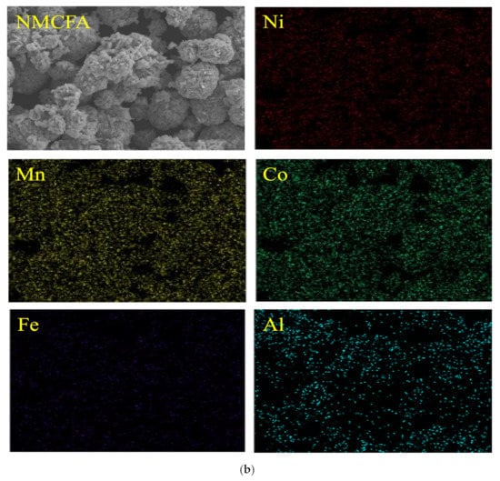 SEM images of the synthesized cathode active materials at different magnifications are shown in Figure 1. Both NMC and NMCFA have spherical secondary particles consisting of granular primary particles, which indicates that trace amounts of iron and aluminum do not affect the morphological properties of precursors. This result is consistent with the previous literature that has investigated the effects of iron or aluminum on the morphology of NMC [,]. Table 1 shows the concentration of constituent metals in the cathode active materials analyzed by ICP-MS, which indicates that both samples were synthesized in accordance with the designed composition. In addition, Figure 2 shows the even elemental distribution of constituent metals (Ni, Mn, Co, Fe, and Al) in the cathode active materials of NMC and NMCFA.