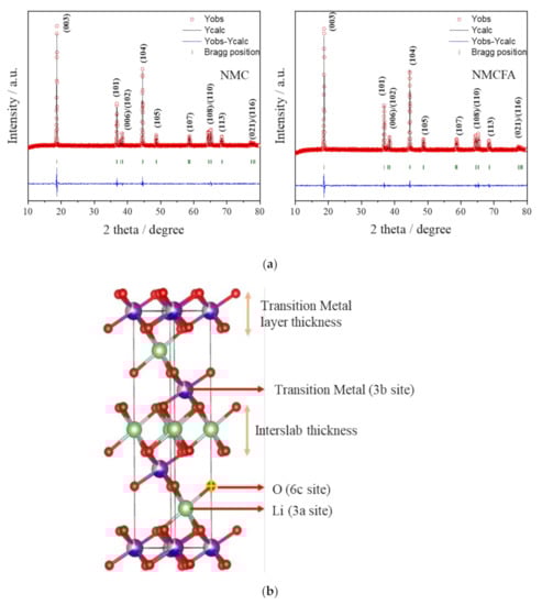 Powder XRD patterns of NMC and NMCFA are presented in Figure 3. The XRD peaks of the cathode active materials correspond to a layered structure based on the hexagonal α-NaFeO2 with a space group of R-3m. The (006)/(102) and (108)/(110) peaks show clear peak splitting, indicating a well-ordered layered structure. It is known that if there is no distortion in the direction of the c-axis in a hexagonal lattice or the crystal structure is perfect cubic, the peak splitting of (006)/(102) and (108)/(110) peaks is not observed. However, the oxygen sublattice in the typical O3-type (ABCABC stacking) layered transition metal oxide structure forms clear splitting peaks in the XRD patterns []. Consequently, trace amounts of iron and aluminum do not impede the formation of an O3-type layered structure, consistent with the previous literature [,]. Lattice parameters of the cathode active materials based on XRD data are calculated by Rietveld refinement as shown in Table 2. The refined lattice parameters of the NMC sample are in good agreement with the values reported in the previous literature []. In the O3-type layered structure, lithium ions, transition metal ions, and oxygen ions are generally located on 3a, 3b, and 6c sites, respectively, as displayed in Figure 3b. Some Ni2+ ions on 3b sites can migrate to 3a sites during the synthesis process because the ionic radii of Ni2+ and Li+ are similar, which is called cation mixing [,]. However, the calculated values of intensity ratio of (003) to (104) peaks for both NMC and NMCFA are over 1.2, which would mean that there is less cation disordering. Meanwhile, no obvious differences in the lattice parameters a and c are observed between NMC and NMCFA, as seen in Table 2. The layer thicknesses of the transition metal (TTM) and the interslab (TLi) were calculated to further investigate the structural properties of NMC and NMCFA in detail. In the case of NMCFA, the TTM was reduced, whereas the TLi was increased compared to that of NMC. The increased TLi of NMCFA could lead to a kinetically favorable effect for an electrochemical property related to the diffusion of lithium ions.