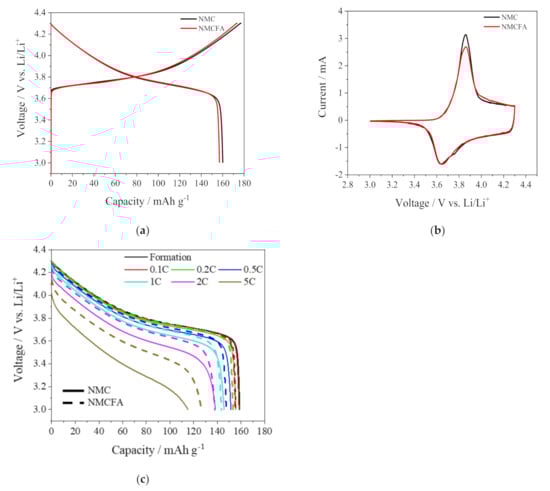Comparison of the galvanostatic charge and discharge processes of NMC and NMCFA: (a) voltage profiles of initial cycling at 0.1 C, (b) initial cyclic voltammograms at a scan rate of 0.1 mV s−1, and (c) discharge curves at different C-rates from 0.1 to 5 C.
