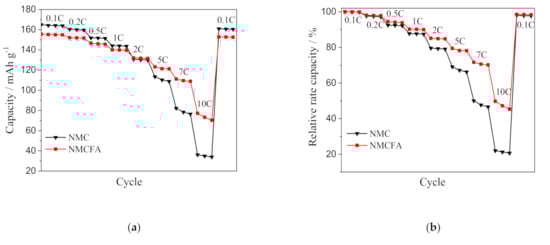 (a) Rate performance and (b) the corresponding relative rate capability of NMC and NMCFA at various C-rates.