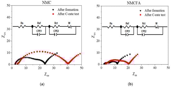 Nyquist plots of (a) NMC and (b) NMCFA before and after the rate capability test with insets of equivalent circuits.