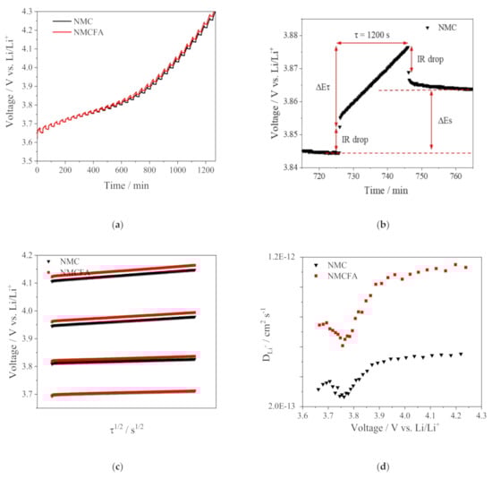 GITT was carried out to estimate the lithium-ion diffusion coefficient (DLi+) and to further understand the kinetic behavior of the cathode active materials as presented in Figure 7. The experimental GITT is based on chronopotentiometry under equilibrium conditions and is used as an effective measurement to obtain the DLi+ []. The GITT curves of NMC and NMCFA during the second charge process of the formation step are displayed in Figure 7a. The current pulse vs. voltage profile for a single titration is presented in Figure 7b, where ∆Eτ is the total change of cell voltage during the current flux and ∆Es is the voltage change between steady states []. The DLi+ can be determined by solving Fick’s second law of diffusion as follows []:
