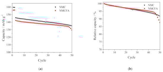 Figure 8 shows the cycling performance of NMC and NMCFA at 1 C in the potential range of 3.0–4.3 V. NMCFA has a relatively reduced discharge capacity compared to NMC due to the electrochemically inactive iron and aluminum as confirmed in the CV test in Figure 4b. An abrupt decay in capacity occurred after 45 cycles in the case of NMCFA, with NMC still showing a gradual deterioration for up to 50 cycles. Given that a trace amount of iron or aluminum-doped NMC shows similar or better cyclability than the pristine NMC sample under the same experimental conditions [,], it could be concluded that the synergistic effect of iron and aluminum doping to NMC on the cyclic performance is not achieved. Overall, the multiple ion (iron and aluminum)-doping strategy into NMC is effective for the rate capability enhancement, but it does not work for the cyclic performance.