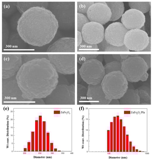 Figure 1 presents SEM images of (a, b) ZnFe2O4 and (c, d) ZnFe2O4/PIn particles and shows that the ZnFe2O4 synthesized through the solvothermal method has a spherical shape. As the core material preceded the PIn coating, surface changes were observed on the rough ZnFe2O4 particle surface. In addition, the PIn coated ZnFe2O4 particles maintain a spherical shape similar to the particles before polymerization, thereby confirming a uniform coating. Figure 1e,f shows the particle size distribution of ZnFe2O4 and ZnFe2O4/PIn, respectively. The average diameter of the ZnFe2O4 and PIn-coated particles is approximately 256.1 and 274.6 nm, respectively. In addition, it can be also noted that some fractions with a size below 100 nm in Figure 1f might be the uncoated pristine PIn particles even though the synthesized hybrid particles were separated using a magnet.