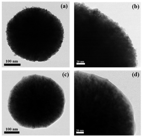 Figure 2 presents TEM images of (a, b) ZnFe2O4 and (c, d) ZnFe2O4/PIn core/shell particles. Figure 2a,b depicts the spherical morphology and rough surface of the core material ZnFe2O4 particles. Figure 2c,d depicts a uniform cover-like PIn coating on the surface of the ZnFe2O4. The shell thickness is approximately 15 nm, which is similar to the average particle diameter data measured by the particle size analyzer in Figure 1e,f.