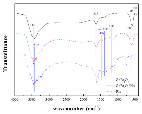 Figure 3 presents the FT-IR spectra of each of ZnFe2O4, ZnFe2O4/PIn, and PIn particles with a wave number from 400 to 4000 cm−1. In the spectra of the core ZnFe2O4, signals at 3433 and 1635 cm−1 were present due to the stretching vibration of the OH group. Signals at 582 and 434 cm−1 show the stretching vibrations of Fe-O and Zn-O, respectively [26]. In the spectra of PIn, a peak at 3410 cm−1 indicates N-H stretching bonds, and peaks at 1618 and 1572 cm−1 indicate aromatic C=C stretching bonds. Peaks at 1456 and 1385 cm−1 indicate the stretching bonds of C-N and C=N, respectively. In addition, in and out-plane C-H bonds of the benzene ring were detected at 1182 cm−1 and 744 cm−1, respectively [27]. The peaks identified in ZnFe2O4 and PIn were also detected in ZnFe2O4/PIn core/shell particles, confirming that ZnFe2O4/PIn particles were well synthesized.