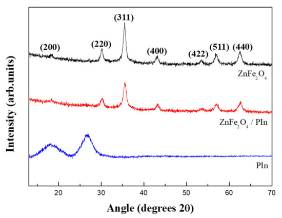 Figure 4 shows the XRD pattern for the analysis of the crystal structures of ZnFe2O4, ZnFe2O4/PIn, and PIn particles. The diffraction peaks of spinel ZnFe2O4 particles were detected at 2θ = 18.2°, 30.1°, 35.4°, 43.1°, 53.5°, 56.9°, and 62.5°, which correspond to the (200), (220), (311), (400), (422), (511), and (440) crystal planes, respectively [16]. In contrast, the XRD pattern for PIn exhibits two major peaks. One broad peak appears at 18.0° owing to the amorphous structure, and the second peak appears at 26.4° owing to the partial crystallinity of PIn [28]. As shown in Figure 4, the diffraction peaks of ZnFe2O4/PIn are almost the same as those of ZnFe2O4, demonstrating that the principal influence on ZnFe2O4/PIn crystallinity is the ZnFe2O4. The reason why no significant signal originated from PIn compound in the ZnFe2O4/PIn was observed from the XRD might be due to the fact that the coating thickness of PIn was about 15 nm, which is very thin compared to the size of the ZnFe2O4 core. In addition, it could also be explained because the crystallinity of ZnFe2O4 metal oxide particles is very high compared to that of the polymer [29].