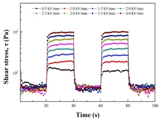 The CC17 geometry used for ER measurement was 16.66 mm in diameter for the bob and 18.08 mm in diameter for cup. Figure 5 demonstrates the reversible response of the shear stress of ZnFe2O4/PIn particle-based ER fluid when alternately turning the electric field on and off at different strengths. The shear stress increased immediately when the E was applied to the fluid and maintained a steady-state value whilst the electric field remained constant and present. Conversely, without the E, the shear stress returned to its initial low value and the hysteresis behavior disappeared.