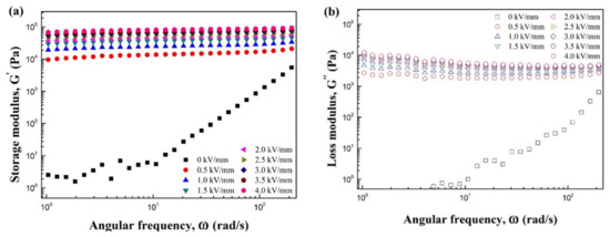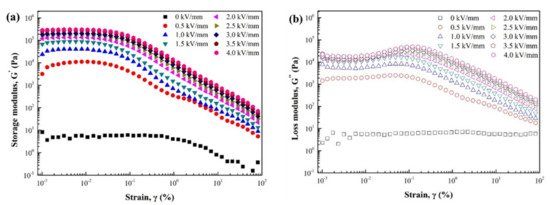 Figure 6 shows that the (a) storage (G′) and (b) loss modulus (G″) behavior changes with a shear strain (γ). At an angular frequency (ω) of 6.28 rad/s, the electric field gradually increased from 0 to 4 kV/mm in 0.5 kV/mm steps. Without the E, the ER sample behaves like a liquid where the G″ is greater than the G′, and both values are lower than those under the electric field. When the E is applied, the G′ is more dominant than the G″ at small strain amplitudes at any field strength. In addition, the modulus remained constant, which was defined as the region of the linear viscoelasticity (LVE) region. As the strain increased, the modulus decreased rapidly. As the G′ began to exceed G″, the solid-like behavior was changed to liquid-like behavior. This is the result of the chain structure induced by the applied E exceeding the strain it can withstand [30].
