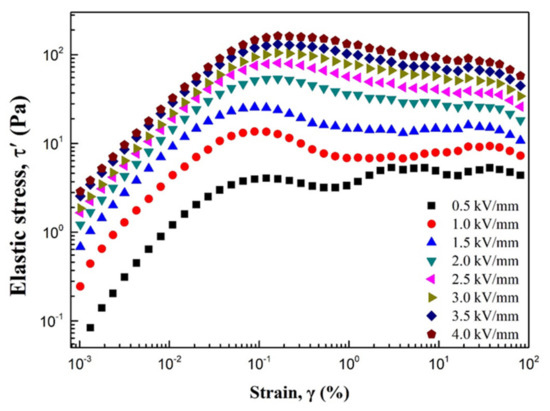Figure 7 demonstrates the elastic stress () under an electric field according to the shear strain. is calculated using Equation (1) using the storage modulus measured in a dynamic amplitude test [31].