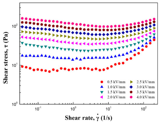 Flow test of ZnFe2O4/PIn particle-based ER fluid was also performed using a controlled shear rate test method. Figure 8 represents the shear stress as a function of shear rate applied where the external electric field was gradually increased from 0.5 to 4.0 kV/mm as extracted from our previous report [21]. As the electric field was applied, each shear stress exhibits a relatively constant value over a certain shear rate range along with a yield stress. This yield stress at a zero-shear rate limit is defined as a dynamic yield stress (τdy). This value implies the minimum value of shear stress required for ZnFe2O4/PIn particles-based ER fluid to start flow. As the electric field strength increases, the shear stress value at the zero-shear rate increases more because the harder chain structure is formed by the influence of electrostatic interaction between interparticles, which is stronger than the hydrodynamic force of the ER fluid.