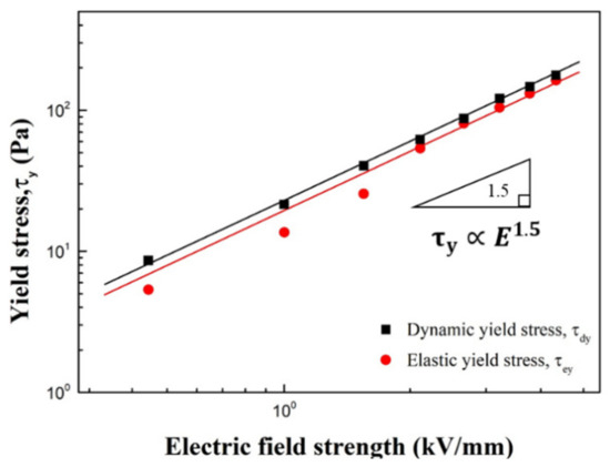 Figure 9 shows the τdy deduced from the steady shear test and the elastic yield stress (τey) obtained from the dynamic test as a function of the electric field strength. τey is the maximum stress that maintains elastic structure recovery when stress due to strain amplitude is removed. τey can be defined as the maximum elastic stress or the value of the deflection point at which the slope change occurs [33,34].