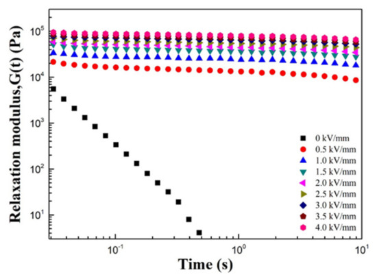 Figure 11 presents the relaxation modulus (G(t)) over time under an applied electric field. The relaxation modulus is calculated by substituting the value of the modulus at a certain frequency range, obtained through the angular frequency test, into the Schwarzl equation (Equation (3)) [38].