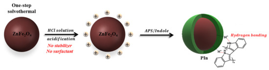 The synthesis mechanism of ZnFe2O4/PIn is shown in Scheme 1. ZnFe2O4/PIn composites with a core-shell structure were manufactured through a synthesis method without surfactants and stabilizers. By maintaining the ZnFe2O4 particles synthesized by the solvothermal method in the HCl solution, the surface of the magnetic particles was acidified and protonated with H+ ions. Then, oxidative polymerization was performed using an indole monomer and an initiator in the next step. Here, indole monomer containing nitrogen element tends to be adsorbed on the surface of magnetic particles through hydrogen bonding with H+ ions on the surface of ZnFe2O4. In addition, indole monomer present around the ZnFe2O4 particles forms PIn shell by nucleating and growing on the surface of magnetic particles through an oxidative polymerization process. Through this mechanism, ZnFe2O4/PIn particles with a core-shell structure are formed [24,25].
