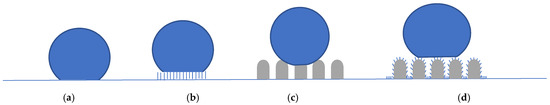 Schematic arrangement of a water droplet on (a) smooth and non-modified surface, (b) smooth and laser-modified surface, (c) surface geometrised during production, (d) hierarchic structure formed during laser modification.