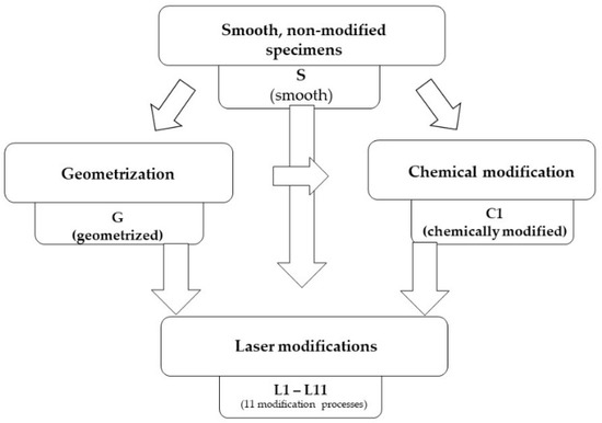 Then, the specimens were vulcanised and subjected to successive geometrical, chemical and laser modifications. Figure 2 shows a flowchart of the procedure described in this paper, including the designation of samples.