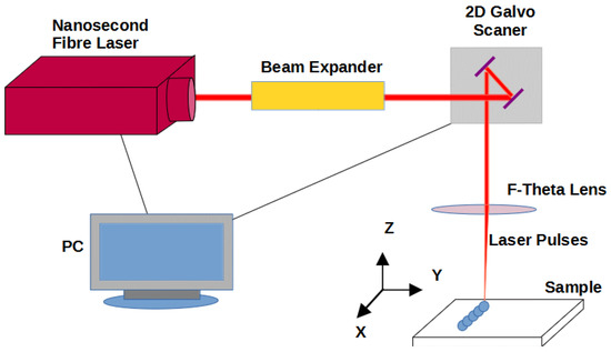 Laser texturing was performed with fibre optics Nd:YAG red Energy G3 SM (SPI) laser, generating the radiation wavelength of 1062 nm. A laser beam focused with a F-theta lens (Geomatec, focal length: 160 mm) was moved along the set trajectory on the surface of sample with Xtreme (Nutfield Techn. Inc., Hudson, NH, USA) scanner. A triangulation meter (Stick, model OD2-P85W20A2) was used to establish the position of sample against the focal plane. The authors modified the surface based on their experience related to polymer surface texturing—the results were presented in a previous paper [29]. Figure 4 shows a diagram of a system for laser modification of polymer samples.