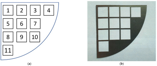 Laser modification of each sample was carried out on 11 square fields, 9 mm side, arranged on the surface of the sample as shown in Figure 5a. In order to determine the influence of the process parameters on the modification results, laser texturing was performed according to the 11 variants (L1–L11) described in Table 2. In some cases, the effect of the laser beam is difficult to notice. In order to localise individual areas after laser modification, a mask was made of 150 µm thick steel foil (Figure 5b), with the geometry and dimensions corresponding to the arrangement of the 11 treatment areas (variants L1–L11, Table 2).