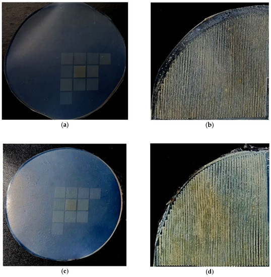 The photos of samples after laser texturing: (a,b)—MVQ silicone rubber; (c,d)—MVQ/C1 silicone rubber; (a,c)—samples with smooth surface; (b,d)—samples with geometrised surface.