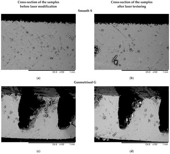 Scanning electron microscope (SEM) image of the samples’ cross-section before and after laser texturing: (a,c) cross-section of the smooth and geometrised samples before laser modification; (b,d) cross-section of the smooth and geometrised samples after laser modification.