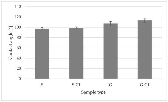 Mean contact angle values for smooth and geometrised samples, non-modified and subjected to chemical modification (S—smooth, non-modified sample, S-C1—smooth, chemically modified sample, G—geometrised, non-modified sample, G—C1 geometrised, chemically modified sample).