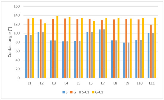 Analysing the data given in Figure 11, it can be observed that the highest values of the contact angle among the chemically non-modified samples were achieved by G geometrised samples after texturing with a laser beam with the parameters given in Table 2 for variant L4 (G-L4—132.8°). The highest increase in the contact angle value against the original smooth sample S was obtained for the G-C1-L3 sample subjected to laser texturing according to variant L3 (G-C1-L3—138.57°).