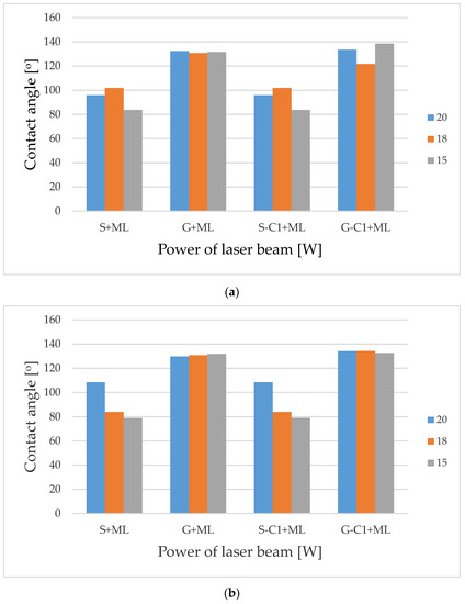 For laser modification (ML), there are two main sets of laser beam parameters. In the first set, the pulse duration t = 220 ns, the scanning speed v = 300 mm/s, pulse repetition frequency f = 35 kHz and hatching h = 100 µm, while in the other set, these values amount to 120 ns, 470 mm/s, 55 kHz and 50 µm, respectively. The contact angle values in the function of laser beam power, measured for the two parameter sets, are shown in Figure 12. The plots obtained for laser modification on smooth, chemically non-modified samples (S + ML) and chemically modified samples (S-C1 + ML) nearly overlap. There are minor differences between the pre-geometrised, chemically modified and non-modified samples. For the other set of the laser beam parameters, the contact angle amounts to approximately 130° regardless of the laser power.
