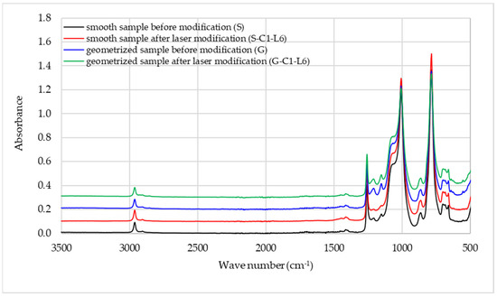 In order to evaluate laser modification impact on the structure of the examined MVQ vulcanisates, the spectra of geometrised, non-modified, and laser-textured samples were IR analysed (Figure 13). A detailed interpretation of the absorbance bands corresponding to the vibrations of characteristic functional groups occurring in the examined vulcanisate structures is presented in Table 6.