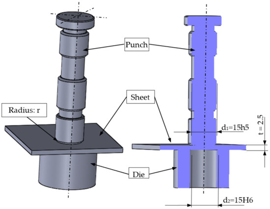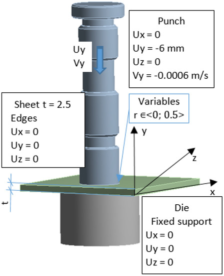 The first stage of numerical modeling is the development of the physical and mathematical model of the nibbling process. A list of phenomena, assumptions and simplifications was separated, and a solid model of tools (die and punch) and an object punched out of sheet metal with a thickness of t = 2.5 mm was developed (Figure 11). The nibbling process can be simplified to a single punching process, provided that the bending moments of the tool (punch) do not change the distribution and pressure values in the contact zone and thus do not cause a deflection of the side punch (small deflection arrow). This simplification is possible only for the case of using large tool diameters and small sheet thicknesses. In the analyzed case, such a simplification was experimentally verified, and a slight deflection of the tool resulting from the bending process was confirmed. In addition, in the nibbling process (punching only with part of the punch), the tool rotates, leading to an even wear of the cutting edge around its entire circumference. For the geometric model (Figure 3), the following initial boundary conditions were developed (Figure 11). The elastic-visco-plastic material model was used to describe the properties of the sheet metal.