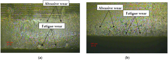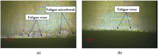 During the nibbling process, the flank face abrasive wear and fatigue wear were mainly found. The coated stamp was characterized by significantly lower abrasive wear after 70,000 working cycles (Figure 4b). Traces of form fatigue by spalling and pitting were visible. It was concentrated directly on the cutting edge of the punch and was not present on the side surfaces of the punch. In the case of the 120,000 cycles of work around the entire circumference of the punch, the contact with the sheet material was mainly caused by the abrasive wear mechanism (Figure 5a). As a result of the cyclical repetition of this phenomenon, there was a gradual degradation of the surface of the tools with a mixed destruction mechanism: grooving and local chipping. The coated punch had a smaller abrasive wear zone. It was characterized by a more regular surface structure and local fatigue wear (Figure 5b).