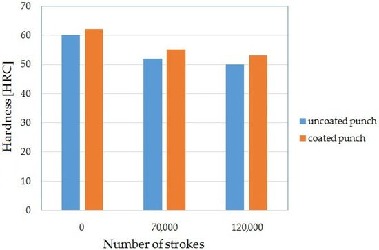 The results of hardness tests are shown in Figure 6. The results show that the coating increased the hardness of the punch from 60 to 62 HRC. The coating hardness was measured by the Rockwell method. This method leaves a small blemish after the measurement; therefore, the measurement with this method can be used as a non-destructive method during the subsequent stages of research. It was found that the hardness of the coating decreased with increasing cycles. For 70,000 working cycles, the hardness of the punch without coating decreased by 13%. For the coated punch, there was a decrease of 11% for the same number of work cycles. For 120,000 cycles of operation, the hardness decreased by 17% for the uncoated punch and by 15% for the coated punch. The reason for obtaining such results is that the coating rubbed off during operation, thereby changing its thickness. It is difficult to measure the hardness of thin coatings because, in this case, the hardness of the substrate is also involuntarily tested; in this case, the NC11LV steel. Undoubtedly, it is a good comparative method to assess the change in the wear of the AlCrTiN—TIGRAL coating layer, which correlates with the diagram in Figure 7. Cryogenic treatment can also be used to increase the hardness of the stamps. The authors of the work in [4] showed that it is possible to increase the hardness of punches by about 2%
