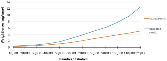 The wear of the punch can be assessed on the basis of the decrease in its mass, which, in this study, was characterized as the mass loss of wear (mg) per unit area (mm2). The area measurements were made with the ATOS Triple Scan system. Samples were tested every 10,000 cycles. The results are the mean of the measurements for five coated and five uncoated punches.