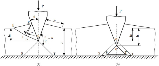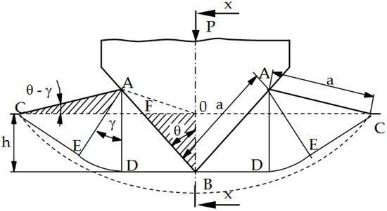During the further process of engaging the rigid wedge (Figure 10b), the material of the workpiece under the tool turns into a plastic state. The material shifts to the sides. The spacing value for a wedge cavity to a depth h > h1 is (h − h1)·tgθ on each side. The same value of the gap exists between the momentary deformation area O’S’T’ under the wedge and the ground. The end of the cut process occurs when S’ and T’ meet, i.e., when h = h2, where:
