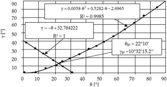 The values of the limit angles θgr and γgr are calculated by solving the system of Equations (1) and (5), assuming: θ = θgr, γ = γgr. Its entangled form means that an approximate solution is necessary, e.g., iteratively or graphically. In this study, the values of these angles: θgr = 22°10′ and γgr = 10°32′15.2″ were determined graphically (Figure 9). The presented proprietary solution makes it possible to determine the γ angle depending on the θ angle used on the tool, and, thus, to evaluate the average contact pressures.