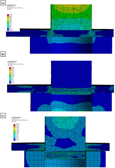The state of reduced stresses in the tool and the punched sheet for various levels of advancement of the process: (a) for 3% advancement; (b) for 10% advancement; (c) for 80% advancement [MPa].