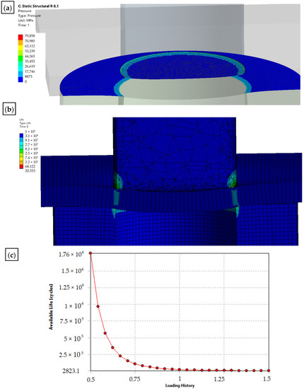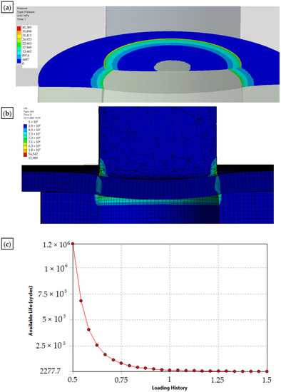 Results of the simulation of the punching process with the use of a sharp punch (without rounding of the cutting edge—r = 0: (a) state of pressure in the contact zone [MPa]; (b) durability; (c) fatigue sensitivity.