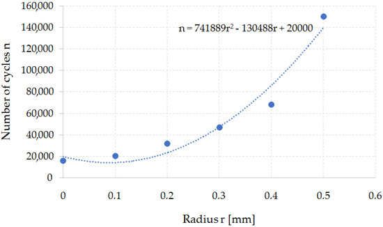 On the basis of the simulations, a dependence curve of changes in the fatigue wear resistance as a function of the punch cutting edge radius was developed (Figure 15).