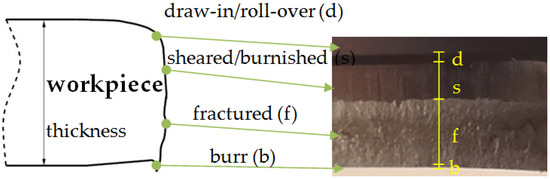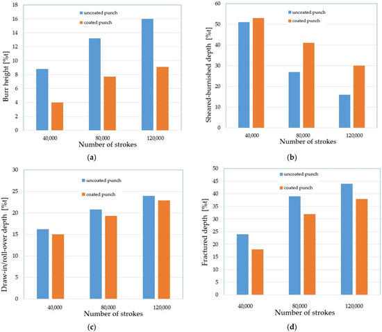 The SEM images of the cut edge of the holes were used in this study to evaluate the part geometry by examining the burr height, sheared–burnished zone, draw-in/roll-over and the fracture on the dependence of the tool wear. Measurements were made at 20 places around the perimeter of the holes. The results were averaged for each zone. The results are shown in Figure 17, where %t is the percentage of the zone width in relation to the thickness of the sheet t (100%t = 2.5 mm). The authors’ previous research shows that one of the key problems in shaping products using mechanical cutting techniques is the formation of burrs on the cut surface [26,32]. The height of burrs can be reduced by an appropriate selection of the technological parameters of the process; mainly the cutting clearance depending on the thickness of the material and its type. The research carried out in this study also showed a significant influence of the degree of tool wear on the burr height. The increase in the degree of wear resulted in an increase in burrs. Burr heights are reduced when a coated punch is used. Even for a small number of cycles of operation, a significant increase in burrs for the punch without a coating can be noticed (Figure 17a). For 120,000 working cycles, the height of the burrs on the cut edge is twice as high for the uncoated punch than for the coated punch. As the degree of wear increases, the width of the sheared–burnished zone (Figure 17b) decreases, whereas the width of the fractured zone (Figure 17c) increases. The width of the sheared–burnished zone for 40,000 cycles was similar for each of the punches (Figure 17b). A significant drop occurred at 80,000 cycles. For the punch with the coating, the decrease was about 12% t; for the uncoated punch, it was about 24% t. For 120,000 cycles, the width of the sheared–burnished zone decreased by 23% t for the coated punch and by 35% t for the uncoated punch. For the same number of cycles, the width of the fractured zone was 38% t for the coated punch and 44% t for the uncoated punch. The draw-in/roll-over width depends mainly on the value of the cutting clearance and increases as the clearance increases. As the research carried out has shown, the extent of the wear also has an impact on the width of this zone, although it is smaller than in the case of the burr and the smooth zone. Compared to 40,000 cycles at 120,000 cycles, an increase in the draw-in/roll-over of about 8% t was obtained for the two punch variants. For the stamp with the coating, the width of this zone was about 2% smaller than for the stamp without the coating (Figure 17d).