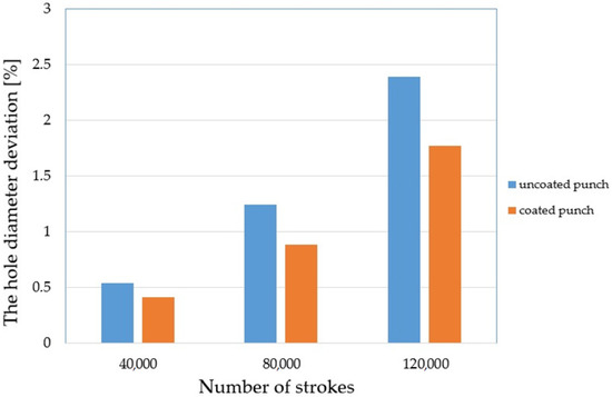 Tool wear impairs the geometry of the punch and a geometrically deteriorated punch creates high tribological loads in the sheet metal punching process. Therefore, the hole geometry is negatively affected [4,27,29]. Figure 18 shows the appearance of the obtained holes after selected work cycles. As the cycle of work increases, the formation of areas on the perimeter of the holes with built-up zones and burrs can be observed (Figure 18c). The conducted research is in line with the trend found in literature. The hole diameter deviation increases (Figure 18b,c) due to the change in the geometry of the cutting edge of the punch. By spreading the coating over the tool, smaller deviations can be achieved. The conducted tests showed a deviation of 0.41% for a stamp with a coating and 0.53% for a stamp without a coating for 40,000 work cycles (Figure 19). For 120,000 cycles, the difference between the punches was 0.62%. The values of the deviation were 1.77% for the stamp with the coating and 2.39% for the stamp without the coating (Figure 19).