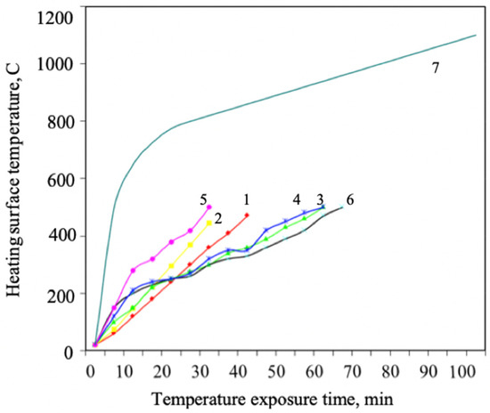 Changes in flame retardant efficiency depending on temperature for formulations with different component content percentages: 1—composition 1; 2—composition 2; 3—composition 3; 4—composition 4; 5—composition 5; 6—composition 6; 7—standard heater temperature conditions.