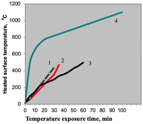 Our results demonstrate that fire retardants for steel constructions increase their fire resistance limit up to approximately 60 min, compared to 15 min for unprotected constructions at steel’s critical temperature of 500–550 °C. Moreover, fire-protective efficiency significantly depends on the formulation [54,55,56,57]. The best fire-protective efficiency was demonstrated by the composition of 55% liquid glass, 25% serpentinite, 5% mica, and 15% polystirol.