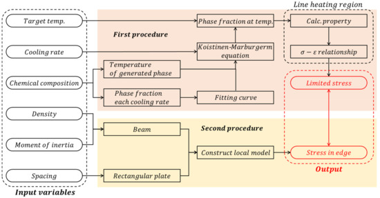 The first procedure is to obtain the stress where the correction effect by the line heating completely disappears based on the inherent strain theory. The input variables for this are the chemical composition of the material, the target temperature, and the cooling rate. Depending on the chemical composition, the temperature at which the generation of bainite, martensite, and pearlite starts and the temperature at which the generation of martensite and pearlite ends are calculated. The cooling rate at which the final phase fraction of bainite and martensite accounted for 100%, 50%, and 0% was calculated by the chemical component. In addition, the cooling rate at which the final phase fraction of martensite accounts for 100%, 90%, and 50% is calculated by the chemical component. Using the relationship between the cooling rate and the final phase fraction, the function to obtain the final phase fraction for arbitrary cooling rates is determined by curve fitting. The amount of the generated phase gradually decreases from the temperature at which a phase starts to be generated to the temperature at which it ends, and a phase fraction for an arbitrary temperature is calculated using the Koistinen-Marburgerm equation that can take this effect into account. To calculate the yield strength after line heating, the yield strength of each phase was calculated using the chemical composition of the material, and these were summed according to the calculated phase fraction. Martensite expands in volume into the body-centered tetragonal (BCT) structure during transformation and the linear strain rate is obtained by considering this expansion. The calculated linear strain was then differentiated to obtain the thermal expansion coefficient. The stress-strain relationship in the line heating area is determined using a disk-spring model based on the inherent strain theory. This process uses the previously calculated yield strength and the thermal expansion coefficient. Next, using the method proposed by Ha [14], the magnitude of the tensile stress at which the correction effect caused by the line heating completely disappears was obtained. In the second procedure, the tensile stress due to the lifting process is calculated by constructing a local model of the ship block based on the plate theory; the input variables in this calculation are the density of the stiffener, stiffener’s moment of inertia, and distance between stiffeners. The local model consists of a square plate and beams, and the size of the square plate is determined by considering the distance between the stiffeners. The beam was connected to the left and right sides of the local model, which was determined by the density and moment of inertia. Finally, the tensile stress of the edges induced by the lifting process was obtained in the local model. By comparing the tensile stress calculated in each process, the ratio at which the correction effect disappears by the lifting process is determined, and the optimal specifications of the stiffener are determined.