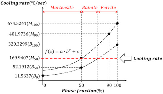 The phase fraction according to the cooling rate in the continuous cooling transformation diagrams for engineering steel can be expressed through Equations (9)–(14), and these data are used as a reference to obtain the final phase fraction relationship curve for all cooling rates in the fitting [18]. As shown in Figure 4, the region on the right side of the line drawn by , and is the phase fraction occupied by martensite and bainite at an arbitrary cooling rate, and the region on the left is the phase fraction occupied by ferrite. In addition, the area on the right side of the line drawn by , and is the phase fraction occupied by martensite at an arbitrary cooling rate.
