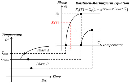 Phase transformation proceeds rapidly at the temperature at which the phase transformation begins and then gradually slows down to reach the final phase fraction (). Phase fraction () at arbitrary temperature () can be expressed using the Kiustinen–Marburgerm equation [19] used to determine the ratio of the phases generated between the start and end temperatures (). In this process, the transformation rate parameter () is considered. Accordingly, the ratio of ferrite, bainite, martensite, and austenite to an arbitrary temperature is obtained as shown in Figure 5.